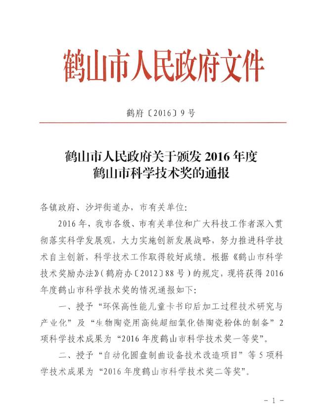 荣获“2016年鹤山市科学技术奖三等奖”